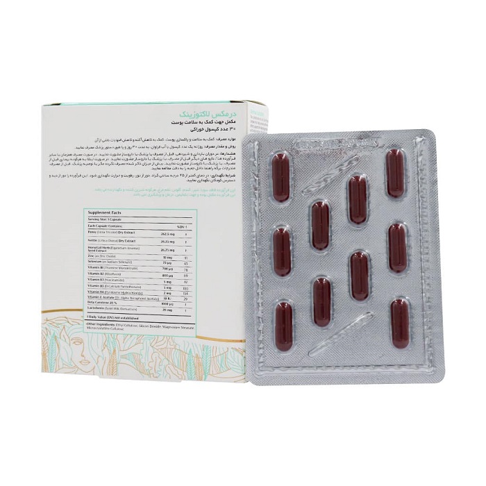 کپسول لاکتوزینک درمکس با داشتن ترکیبات گیاهی و ویتامینهای مورد نیاز بدن به سلامت و پاکسازی پوست کمک میکند. همچنین لاکتوزینک در بهبود التهابات ناشی از آکنه، تاثیر بسزایی دارد. لاکتو زینک را میتوان بهترین مولتی ویتامین برای پوست دانست، چرا که دارای ریزمغذیهایی بوده که باعث ساخت کلاژن و افزایش استحکام پوست و حفاظت از سلولهای پوست، مو و ناخن میشوند. مزیت اصلی لاکتوزینک درمکس به عنوان قرص برای تقویت پوست و مو این است که این قرص توسط جریان خون، مواد مغذی را به عمیق ترین قسمتهای پوست هدایت میکند.